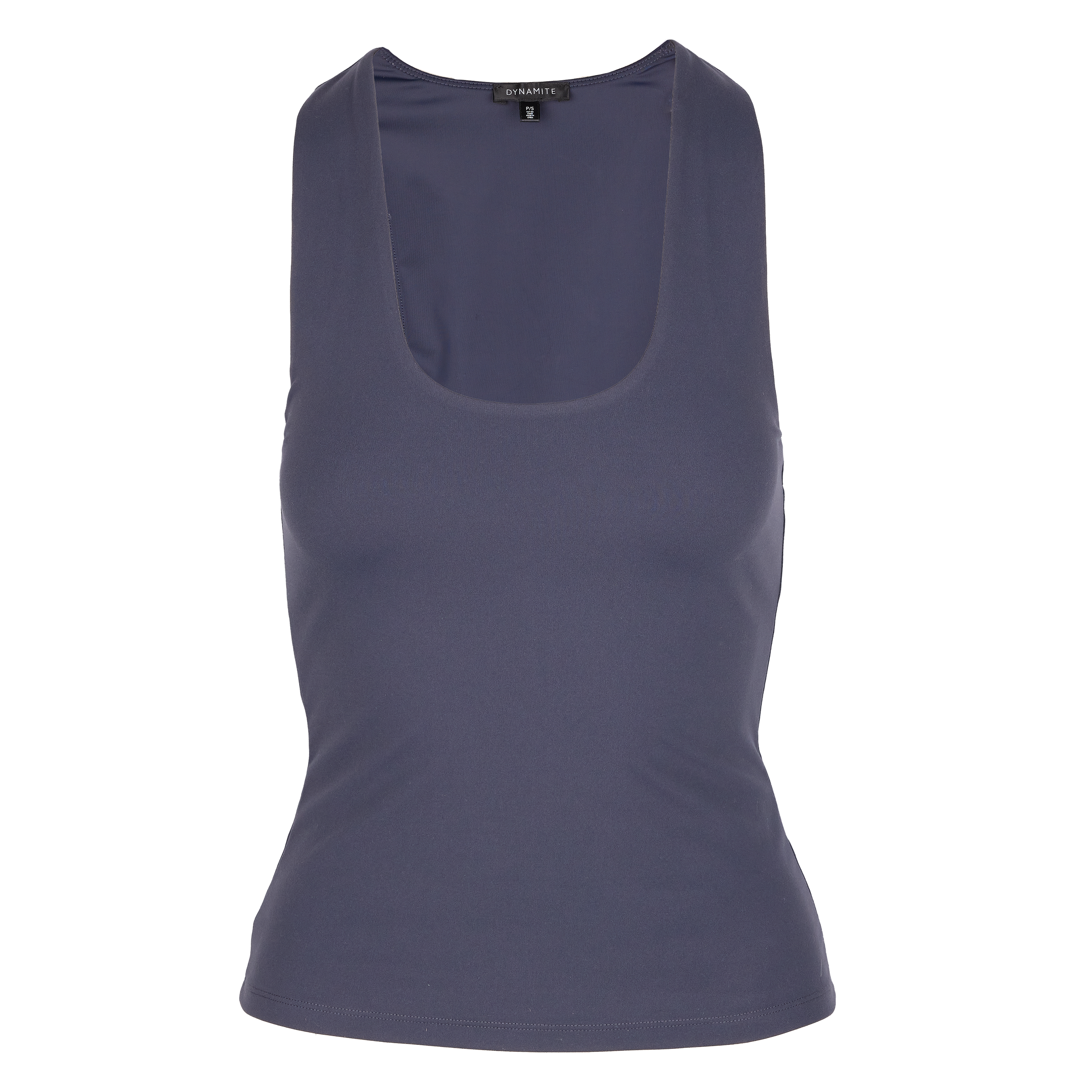 A sleeveless, navy blue athletic tank top with a scoop neckline and a black DYNAMITE label inside the collar.